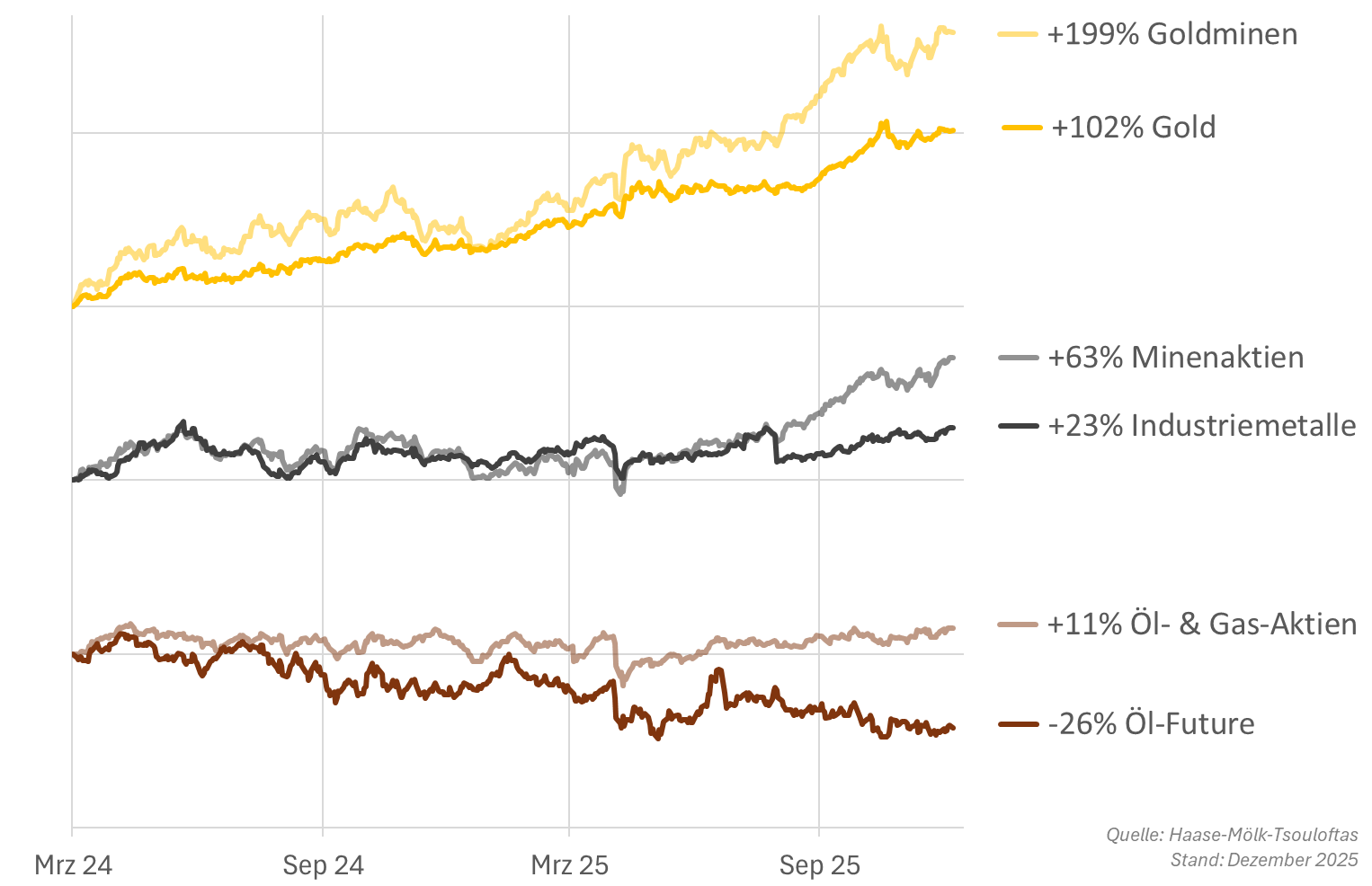 Abb. 1 zeigt ab März 2024 die US-Dollar-Preisentwicklung von Gold & Goldminen, Industriemetallen und Minenaktien sowie Öl und Energie-Aktien