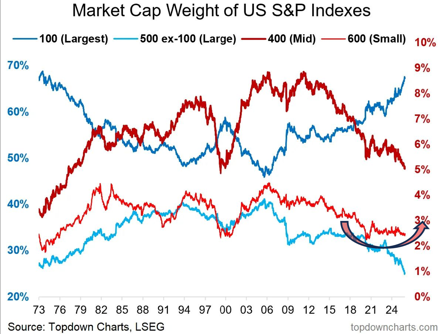 Abb. 2 den Anteil der größten 100 US-Aktien (dunkelblau, linke Skala), der nächstgrößten 400 (hellblau, linke Skala), der mittleren 400 (dunkelrot, rechte Skala) und der kleinen 600 US-Aktien (hellrot, rechte Skala) an der gesamten Marktkapitalisierung der 1.500 wichtigsten US-Aktien im Zeitverlauf seit 1973.