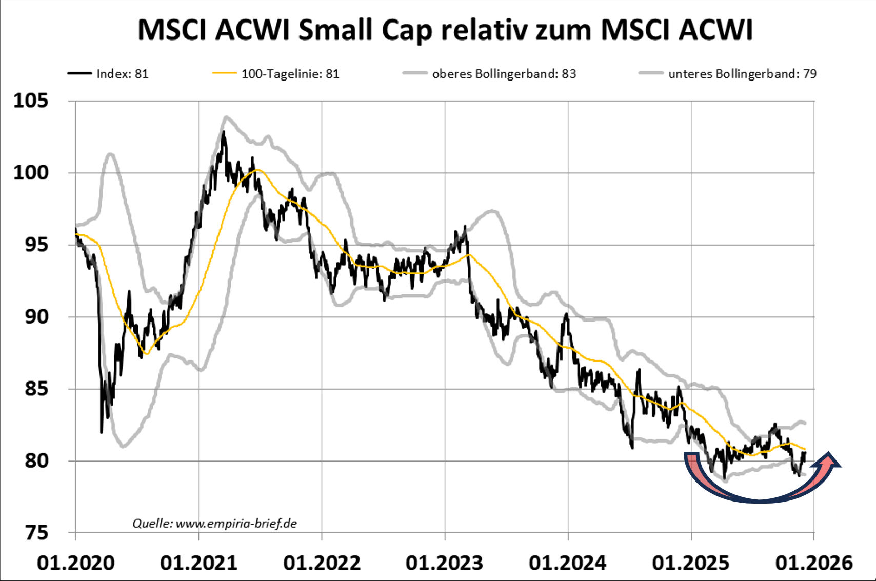 Seit 2025 deutet sich im Verhältnis Small Cap DM/EM zum MSCI ACWI erstmals eine Bodenbildung an (s. Abb. 3). Auch hier passt das Bild: Die KGVs vieler Small-Cap-Indizes liegen rund 30 % bis 40 % unter dem MSCI World, die KBVs sogar 50 % bis 60 % darunter.