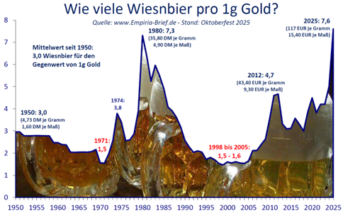 Allerdings war die Kaufkraft eines Dollars Ende der 1990er-Jahre deutlich geringer als die von 1971 oder 1980. Langfristige Vergleiche sind daher schwierig – insbesondere, wenn man den offiziellen Inflationsstatistiken nur bedingt traut. Um reale Größenordnungen anschaulich zu machen, habe ich kürzlich die historischen Wiesnbierpreise als Maßstab für Kaufkraft genutzt. Die Abbildung Nr. 1 zeigt, wie viele Maß Bier man für den Gegenwert eines Gramms Gold erwerben konnte.