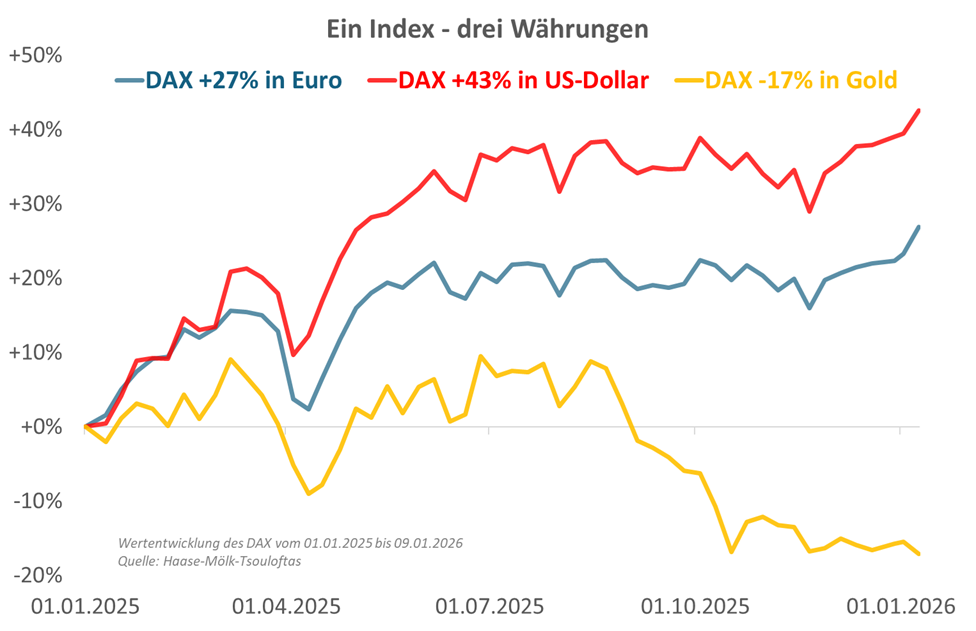 Angesichts der Nachrichtenlage in Deutschland und der Welt dürfte so mancher Kapitalanleger die steigenden Kurse mit Verwunderung oder gar Skepsis verfolgen. Seit Anfang 2025 ist der DAX trotz all der schlechten Nachrichten aus Deutschland um +27 % gestiegen, für in US-Dollar rechnende ausländische Investoren liegt das Ergebnis sogar bei +43 %. Die Entwicklung gemessen in Goldeinheiten (−17 %) würde angesichts der Nachrichtenlage deutlich besser passen. Nicht nur hierzulande (Stichwort: Deindustrialisierung) trübt sich das Bild ein. Auch international ist das Ende einer auf Völkerrecht, UN-Charta und internationalen Verträgen basierenden Weltordnung mit Händen zu greifen (Stichworte: Ukraine, Venezuela, Grönland). Macht ersetzt zunehmend Regeln.