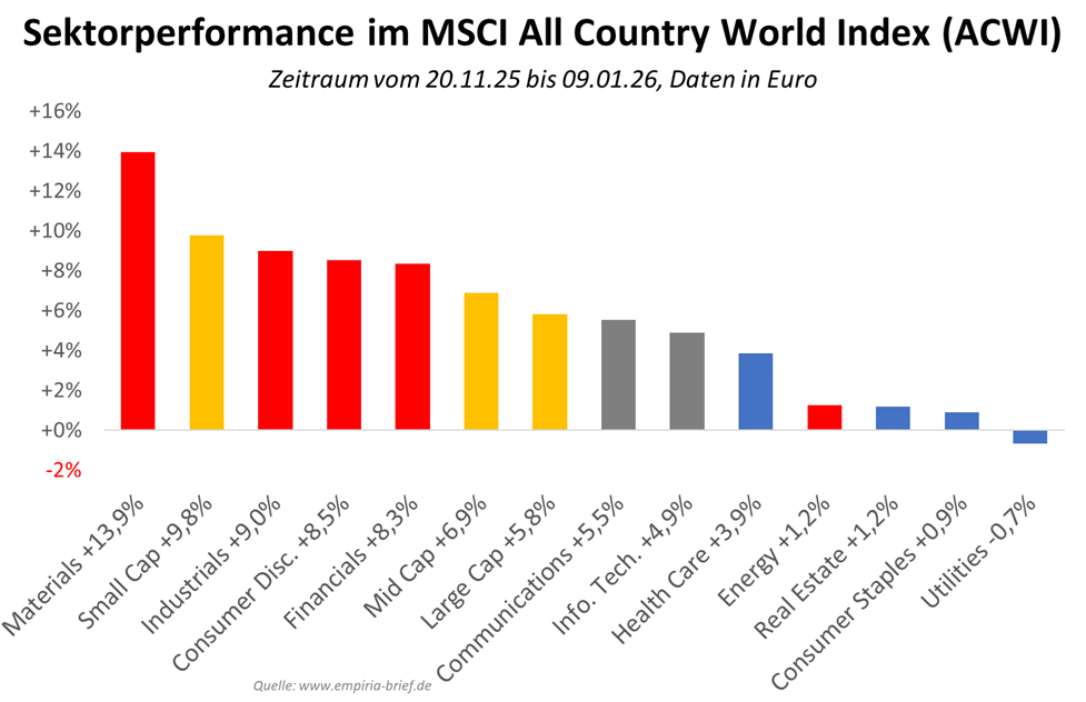 Ein Blick auf die aktuellen globalen Sektorpräferenzen (Abb. 2) bestätigt dieses Bild. In der seit Ende November laufenden Aufwärtsbewegung werden erneut inflationsaffine Sektoren wie Grund- und Rohstoffe, Industrie sowie zyklischer Konsum stark nachgefragt. Defensive und zinssensitive Bereiche wie Immobilien, Basiskonsum oder Versorger bleiben dagegen zurück. Das Signal ist eindeutig: Der Aktienmarkt erwartet mehr Inflation.