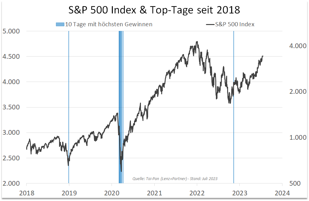 Abb.1 zeigt den S&P-500-Index seit dem 01.01.2018 und markiert in senkrechten blauen Linien die zehn besten Handelstage. Acht der zehn besten Tage fanden im Rahmen des 2020er-Corona-Crashs statt.