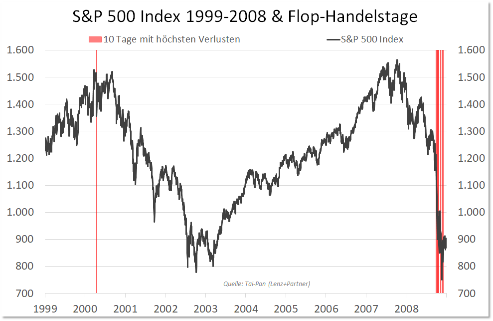 In den Kundengesprächen begegnete mir damals mehrfach die Frage, warum ich Rechnungen schreiben würde, obwohl wir gar nicht investiert seien. Dass Nichtstun hin und wieder durchaus eine bezahlungswürdige Dienstleistung sein kann, wurde im Verlauf des Jahres 2008 leichter erklärbar. Der S&P 500 schloss seinerzeit mit einem Minus von 38,5%.