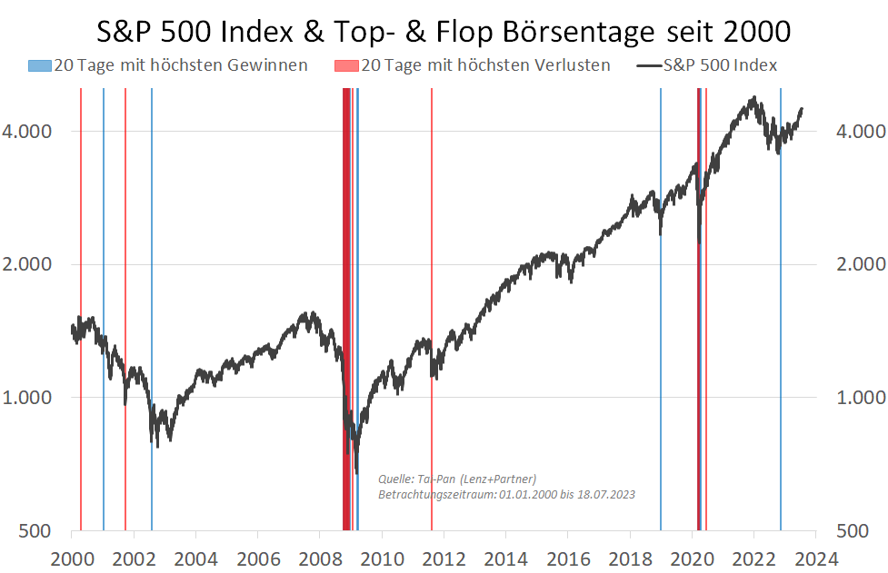 Abb. 5: S&P-500-Index seit 2000 sowie jeweils die zwanzig «besten» und «schlechtesten» Börsentage.